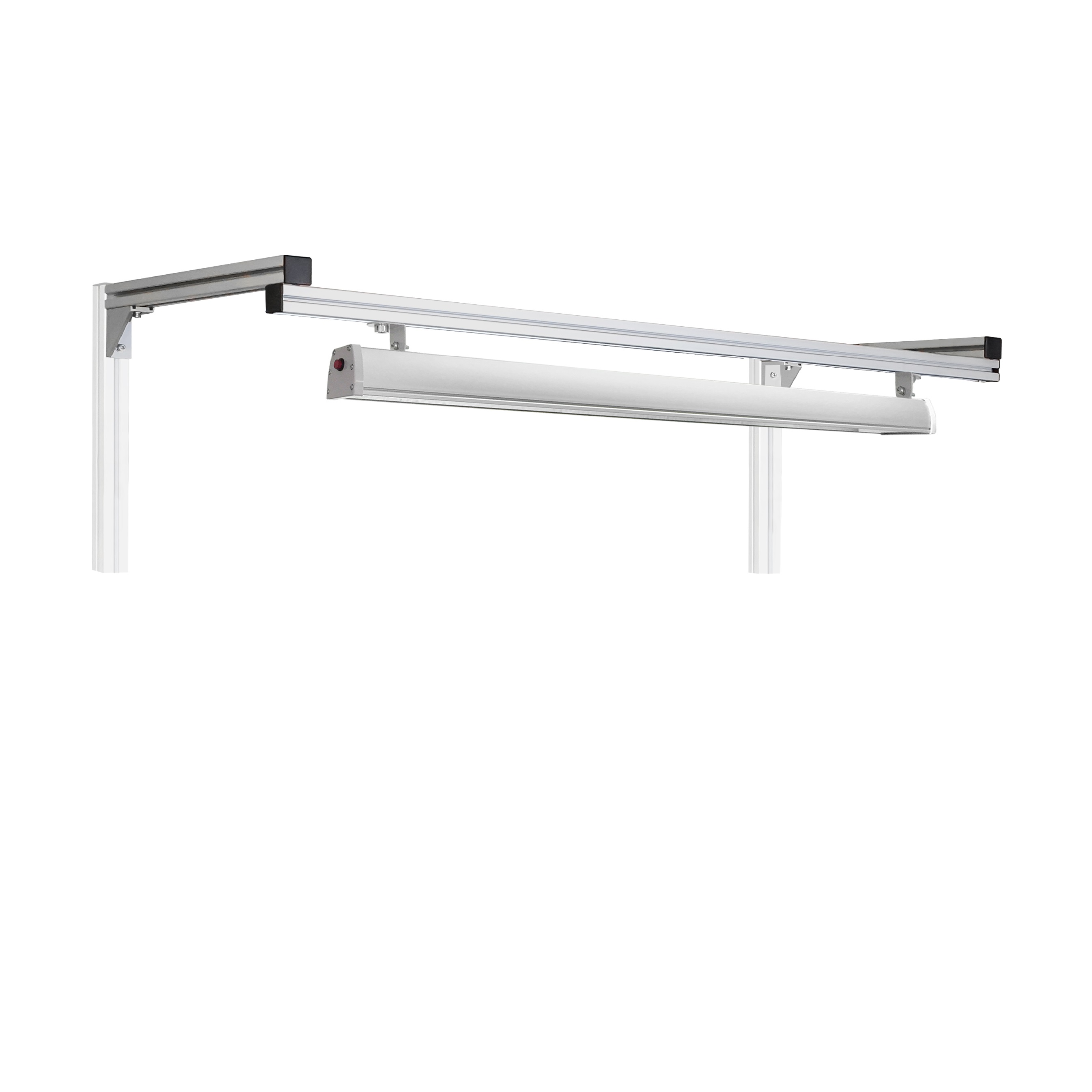 Комплект освещения светодиодный из конструкционного профиля фиксируется на задние стойки на кронштейнах Г-образной формы, регулируется по высоте от уровня столешницы от 400 до 1400 мм, с помощью держателей регулируется направления потока света. В комплект поставки входит кронштейн для крепления освещения, светильник LED светодиодный потребляемая мощность 32-53 Вт., световой поток 4400-6200 Лм, 5000 К, IP40, вилка, провод 2 м, материал рассеивателя — опаловый акрил.