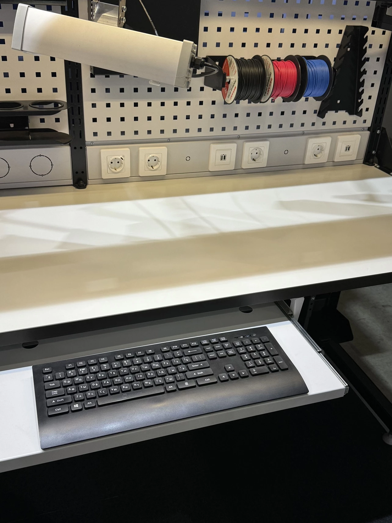 Антистатическая выдвижная полка для клавиатуры, фиксируемая под столом, представляет собой удобное решение для организации рабочего пространства. Она крепится под столешницей, обеспечивая легкий доступ к клавиатуре и освобождая место на рабочем столе. Полка оснащена выдвижным механизмом, который позволяет плавно перемещать клавиатуру в рабочее положение и обратно. Антистатическое покрытие защищает электронные устройства от накопления статического электричества, снижая риск повреждений.