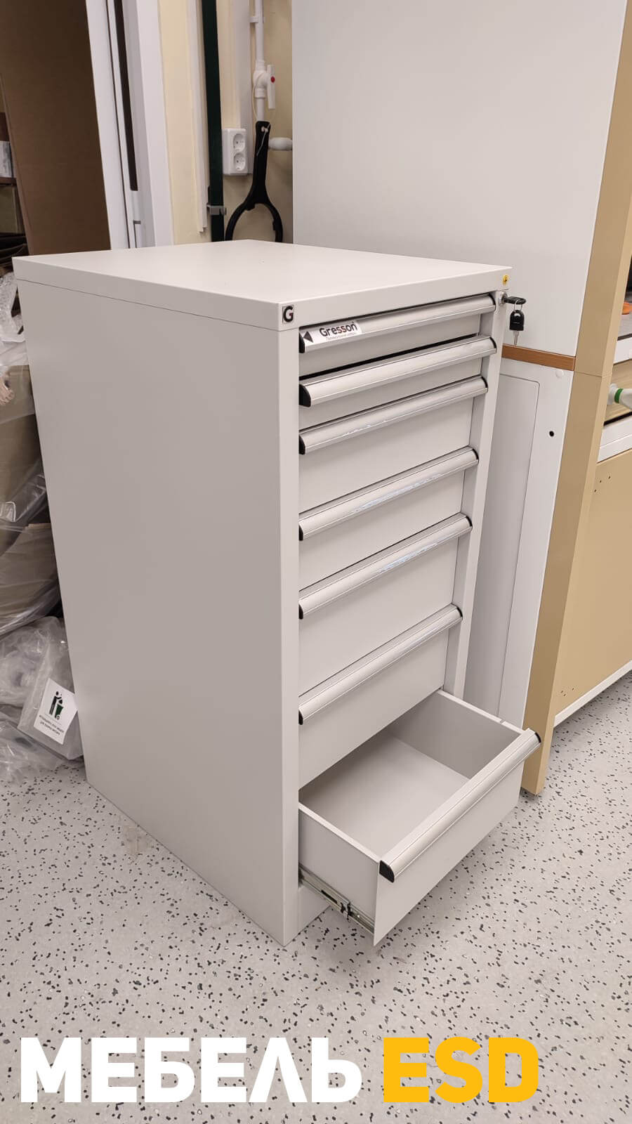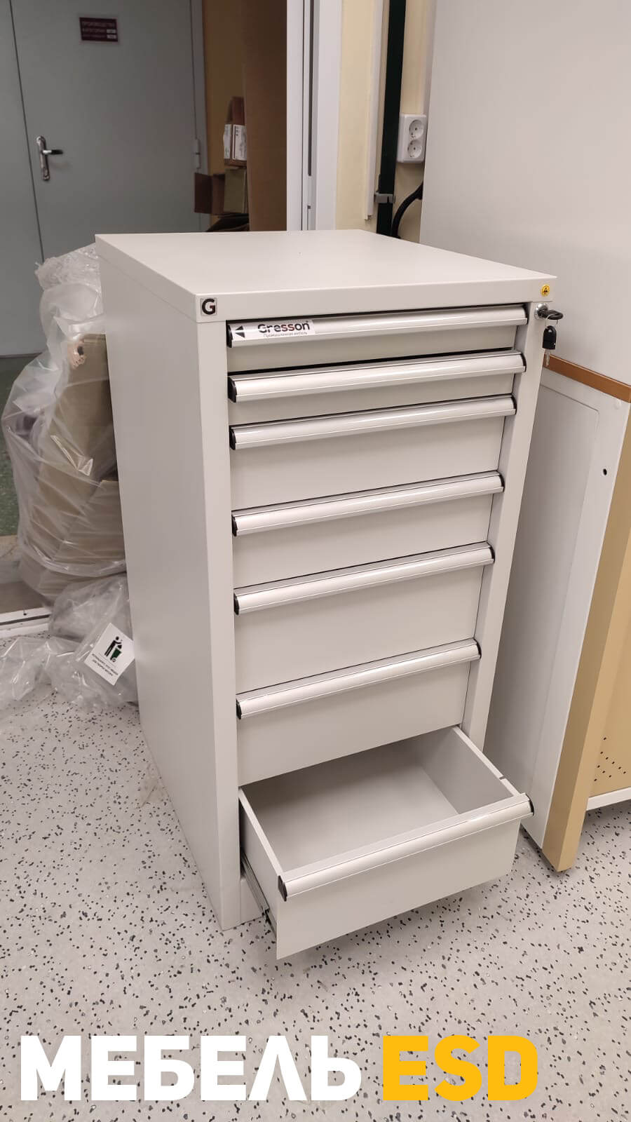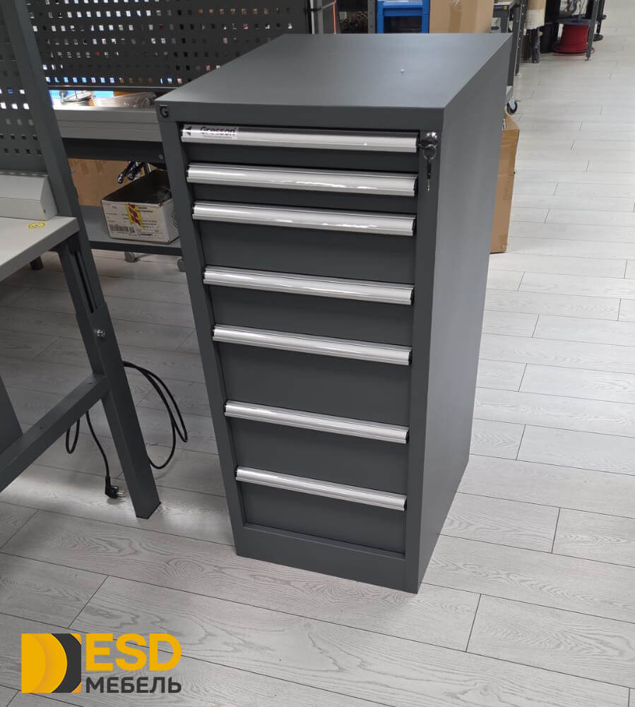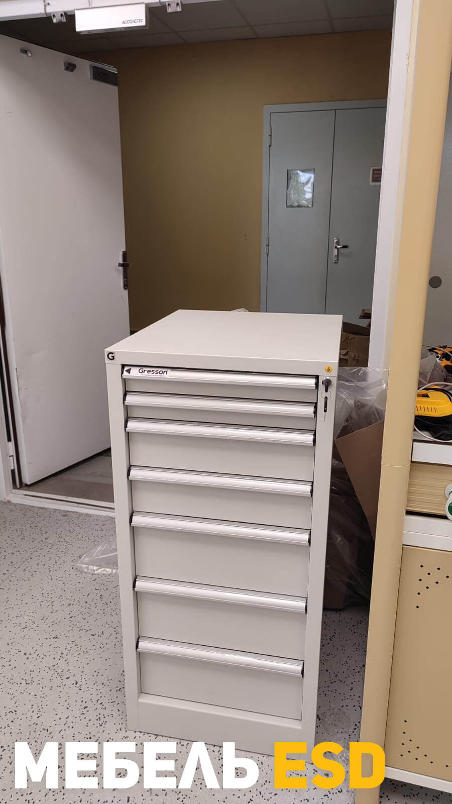 Тумба антистатическая ТС-7 ESD окрашена полимерной антистатической порошковой краской, защищающей электронные компоненты от электростатического заряда. В антистатическом исполнении, согласно требованиям стандарта ГОСТ IEC 61340-5-1-2019, на лицевой стороне тумба имеет маркировку