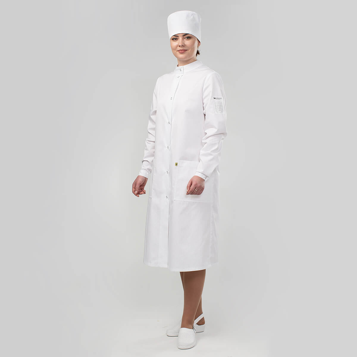 Халат полуприлегающего силуэта с центральной бортовой застёжкой на кнопки. Перед халата цельнокроёный с двумя нижними накладными карманами. В левый нижний карман вшит знак EPA. На полочке по линии груди в размерах 40- 46 вытачки отсутствуют, в размерах 48-66 имеются вытачки. Рукава длинные, втачные, одношовные с цельнокроёными манжетами на кнопку (2 положения фиксации). На внешней стороне левого рукава настрочена нашивка с надписью «Одежда технологическая для персонала чистых помещений», с таблицей циклов обработки и датой выпуска изделия. На нашивке имеется свободное место для нанесения потребителем знаков идентификации персонала. Спинка цельнокроёная с вытачками, заложенными вниз от плечевого шва. По линии талии расположен хлястик с застёжкой на кнопку. Воротник — стойка с застёжкой на кнопку. С изнаночной стороны под воротником — стойкой имеется вешалка.